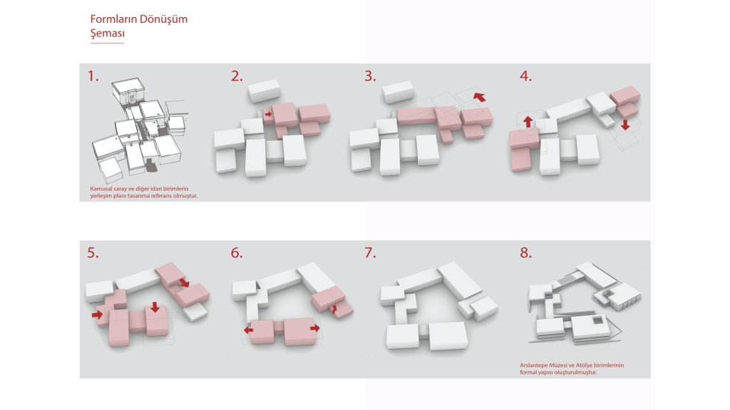The design ideas were to get inspiration from the Arslantepe Mould for every decision and harmonize the museum with the existing building texture. Firstly, the building texture was analyzed, and it was seen that the site consists of small dwelling houses which were located on the site without any geometrical order. This is why it was decided not to construct a compact, one-piece building. Then, we analyzed the datum coming from the excavations, and the form of the complex consisting of the public castle and administrative structures was considered suitable for this site. Furthermore, getting inspiration from this plan would have made our museum respect the site’s history.